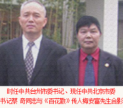 《百花散》傳人梅先生與中共臺州市委書記陳奕君同志合影紀念2018年7月《百花散》傳人梅先生與中共臺州市委書記陳奕君同志合影紀念2018年7月      天臺山古代中醫食療植物方梅氏《百花散》開發十年以來,已經使各類胃腸疾病患者及肝硬化腹水病人數萬人(包括胃病變、腸病變、食道病變、肝病變患者)恢復健康,得到廣大患者一致好評,并在康復患者中發展了數百名愛心使者擔任各地代理,為病痛患者服務引起社會強烈反響。古代傳世植物食療方《百花散》系列產品對胃病變、腸病變、食道病變、肝病變有神奇康復效果,已使眾多的重癥患者得到有效食療并康復。這一消息不脛而走,引起了河南省抗癌協會、河南省保健品協會、鄭州市腫瘤康復協會相關專家教授的高度重視,被禪醫武著稱的少林寺藥局局長釋延琳大法師和中國道教協會副會長、江西龍虎山天師府張金濤天師稱為中華民族之瑰寶,并得到社會各界人士和媒體關注。